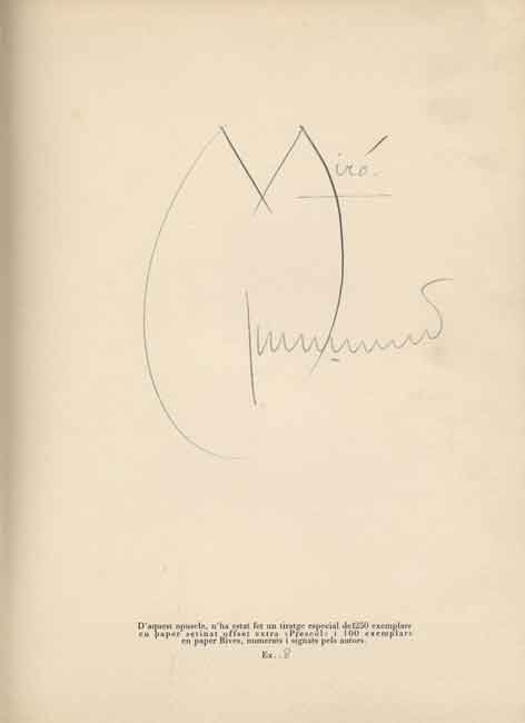 Álbum compuesto por cuatro litografías (una de ellas doble) en papel Rives. El número de copias y la firma del autor y del artista se encuentran en el interior de la cubierta posterior. El título está impreso en la contraportada. El álbum se cubre con una hoja de papel Ingres verde con la impresión en negro delante y atrás. La edición es de 100 ejemplares, y de 500 ejemplares la litografía que cubre la portada y contraportada. Todos los ejemplares están firmados y numerados a lápiz por Joan Miró. Editor: Joan Perucho. Impreso en Maeght. Número de catalogación: 86. Catalogado en la página 234 de Joan Miró. The Illustred Books. Catalogue Raisonné. Patrick Cramer. Geneva, 1989.