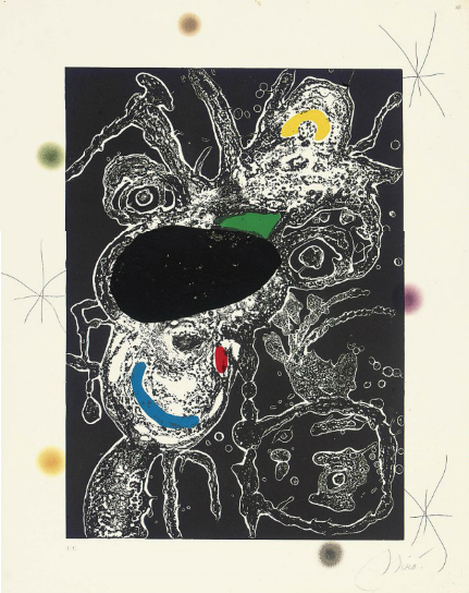 Bibliografía: "Miro Graveur. Volume III" (reproduit p. 193) Note : Extremadamente raro, tirada de 50 ejemplares destinadas solamente a acompañar 5 poemas de Salvador Espriu